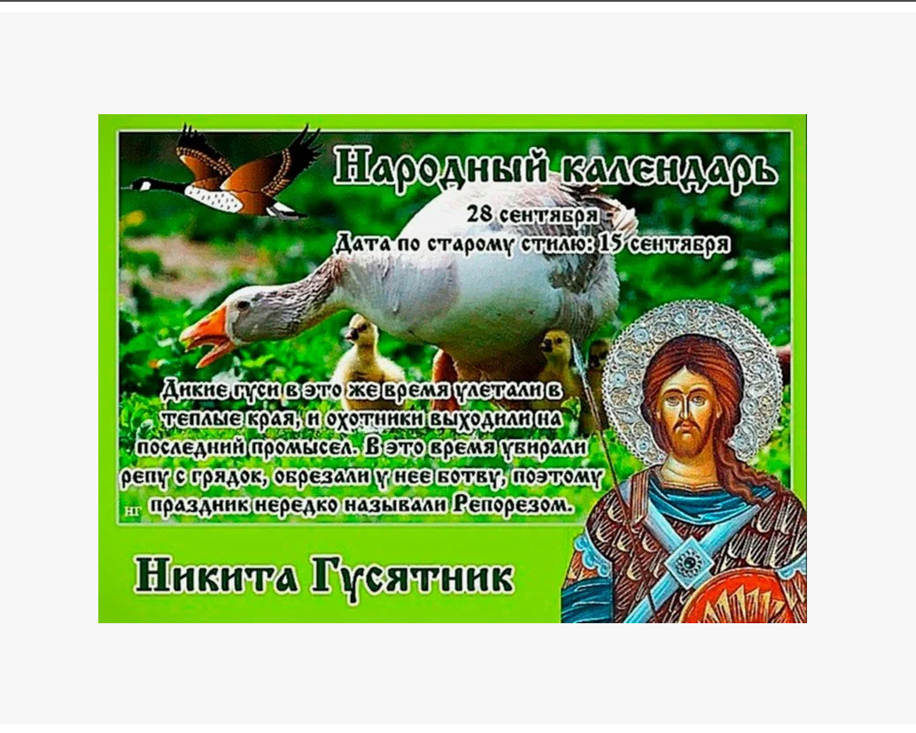 Православная церковь в этот день отмечает память преподобного Никиты Халкидонского, исповедника. В народе же святого называли стражем гусей, а попросту — Гусятником.