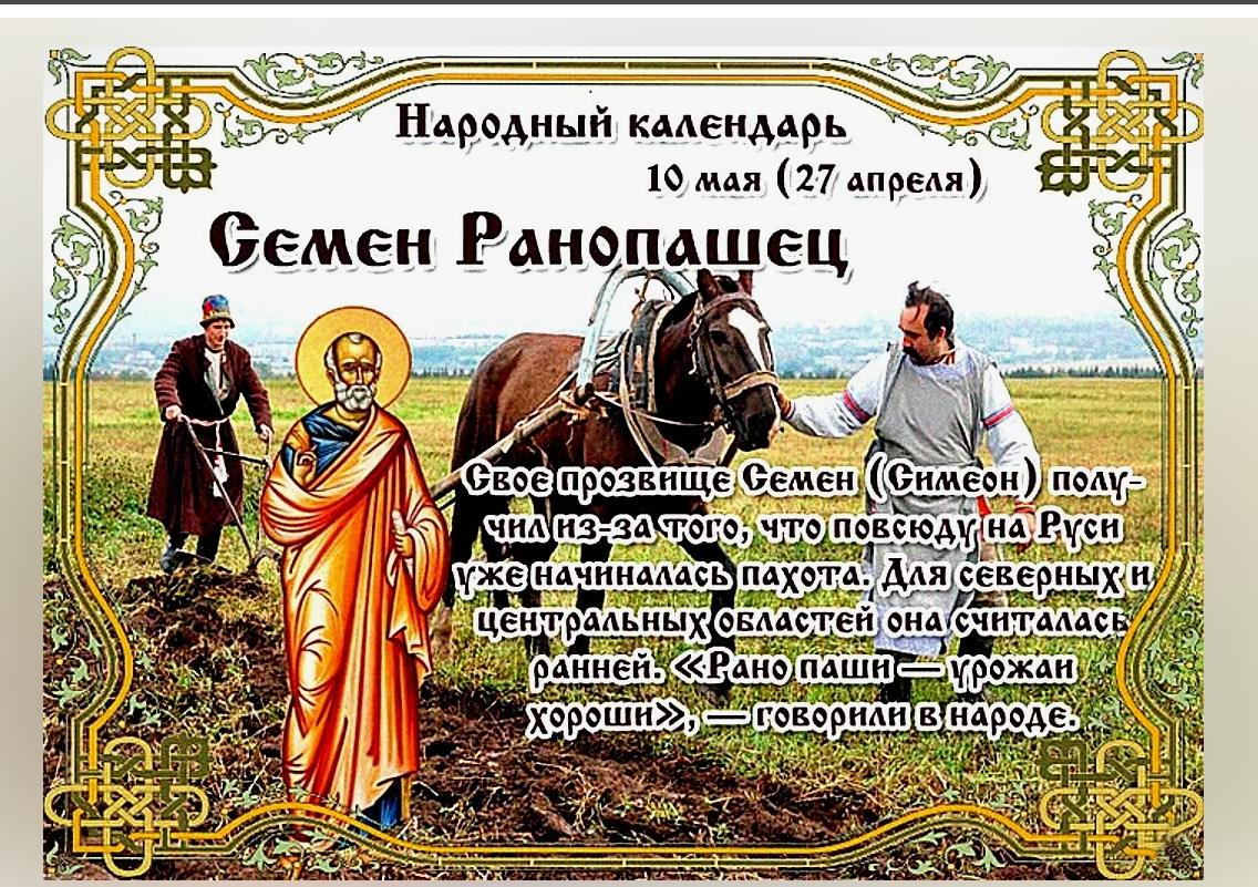 Народный праздник Семен Ранопашец отмечается 10 мая 2024 года (по старому стилю – 27 апреля). В православном церковном календаре эта дата посвящается апостолу от 70-ти Симеону Иерусалимскому, сроднику Господнему по плоти, епископу.