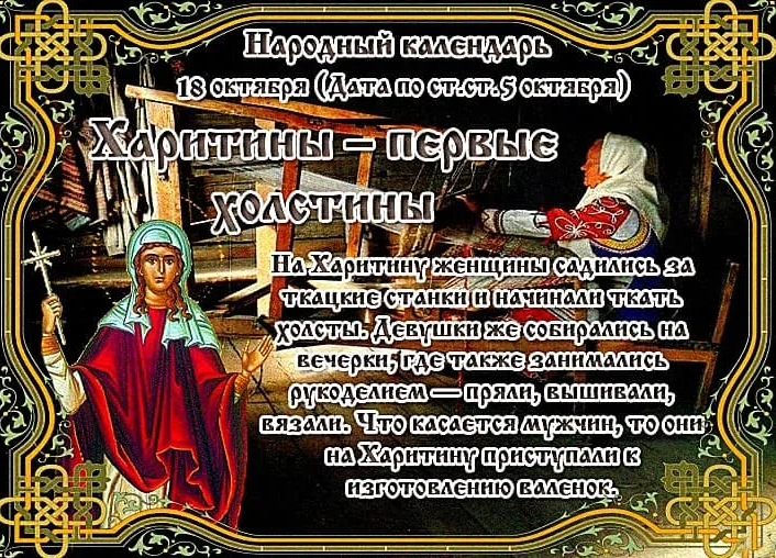 18 октября 2023 года (дата по старому стилю – 5 октября) христиане почитают святую мученицу Харитину. В этот день девушки и женщины начинают ткать холсты, поэтому в народе данный праздник и назвали Харитины – первые холстины.