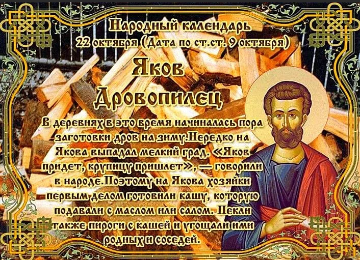 22 октября 2023 года (дата по старому стилю – 9 октября) верующие православной церкви чтут память Иакова Алфеева. Согласно церковным сказаниям, он являлся одним из 12 апостолов Иисуса Христа, а также братом апостола Матфея. Народное название праздника – Яков Дровопилец.