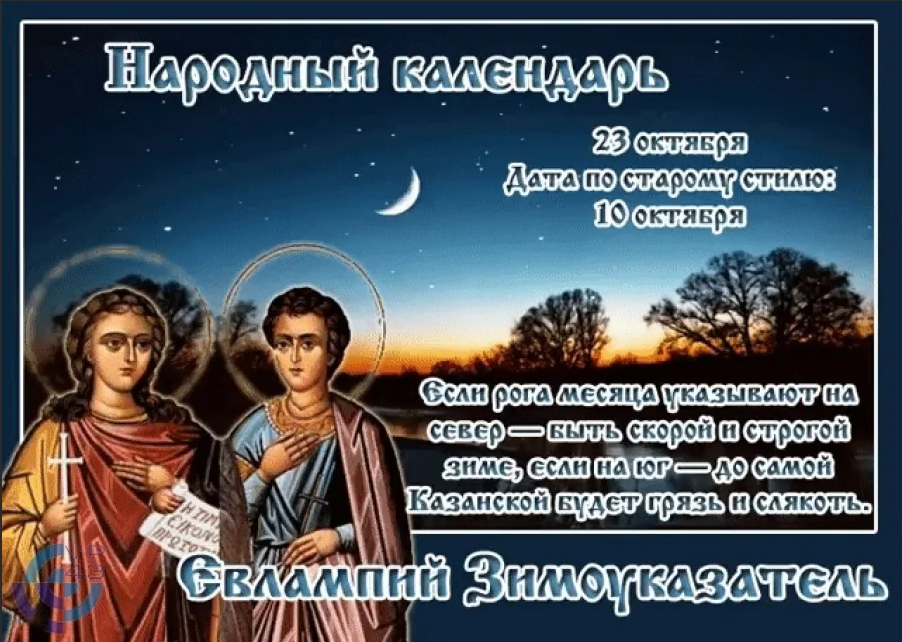 23 октября 2023 года (дата по старому стилю – 10 октября) прихожане православной церкви чтут память святых мучеников Евлампия и Евлампии. В народе этот день получил название Евлампий Зимоуказатель, потому что благодаря его приметам люди могли определить, как скоро наступит зима.