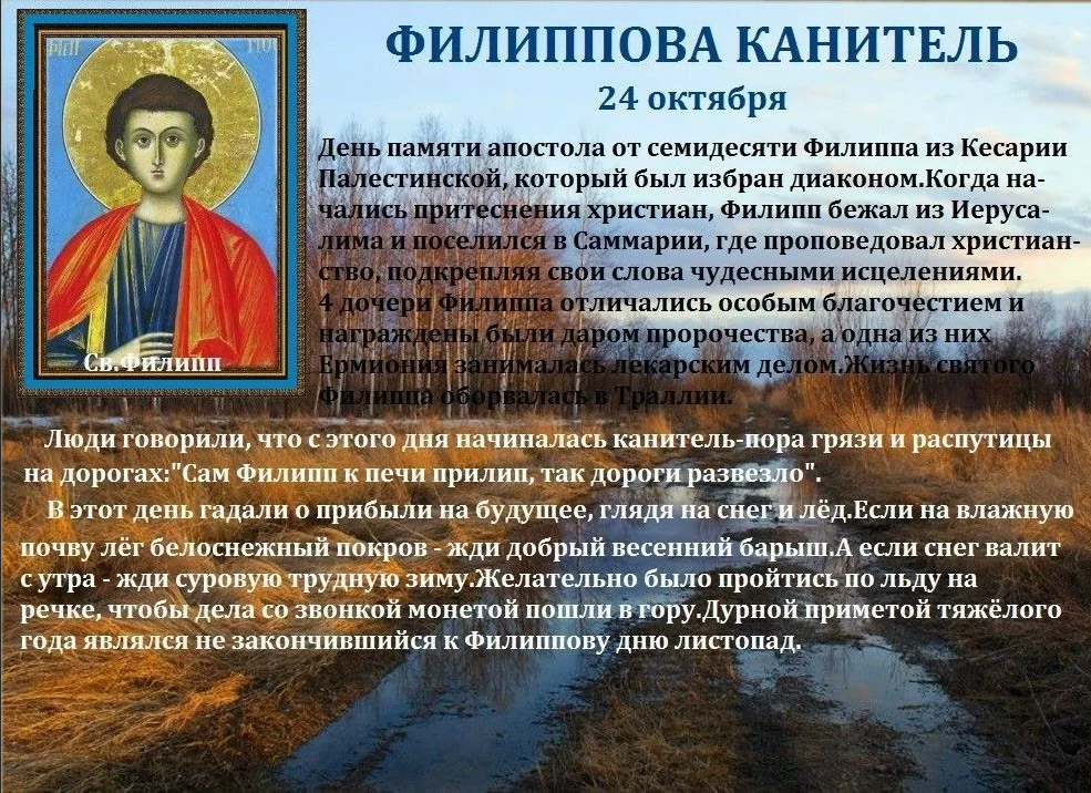 24 октября 2023 года (11 октября по старому стилю) отмечается народный праздник Филиппова канитель. Такое название он получил за то, что это было время грязи, слякоти и распутицы, а дни начинали тянуться. В церковном календаре – это дата памяти одного из апостолов от 70-ти, святого Филиппа.
