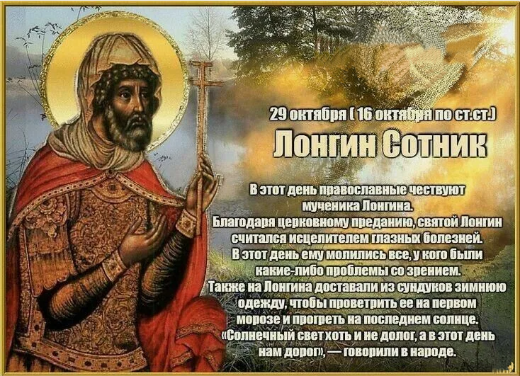 29 октября 2023 года (16 октября по старому стилю) верующие православной церкви чтут память троих Лонгинов – Сотника, Печерского привратника и Яренгского. В народе эта дата имеет и другое название – День зрения, по причине исцеления первого святого от катаракты во время смерти Христа.