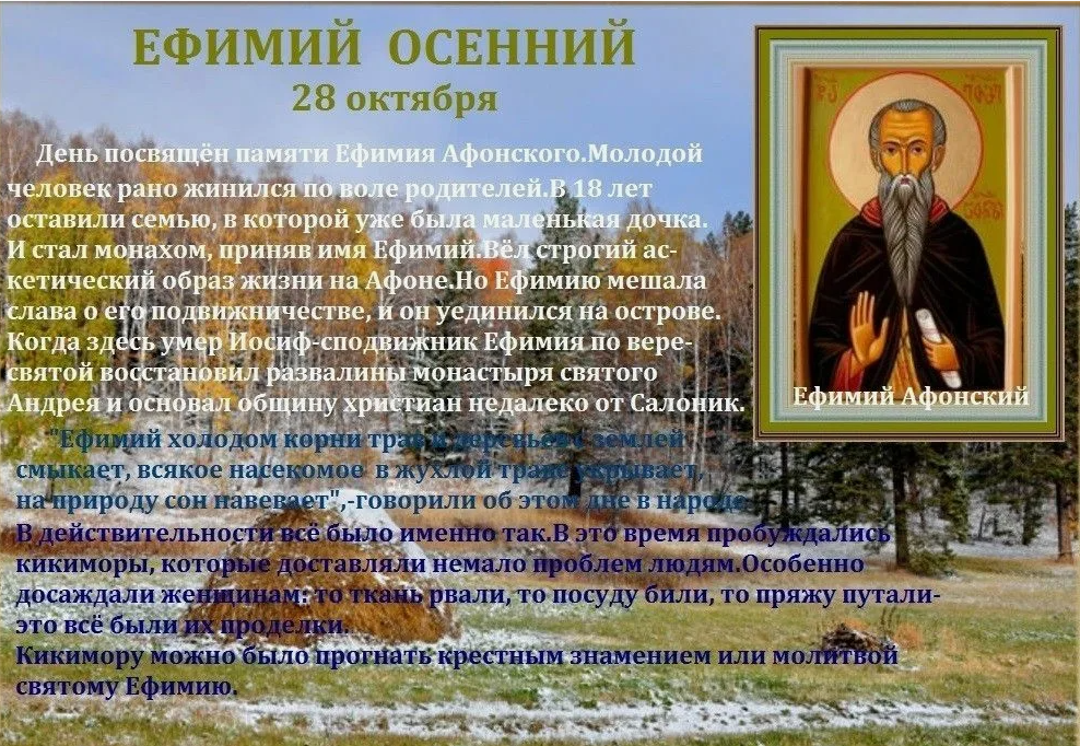 Народный праздник Ефимий Осенний отмечается 28 октября 2023 года (15 октября по старому стилю). В церковном календаре – это дата памяти святого Евфимия Солунского (имя при рождении – Никита).