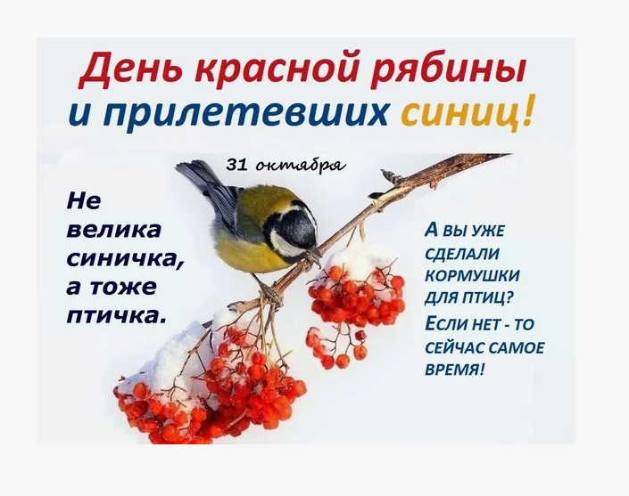 31 октября день когда хочется ярких красок и чуда, потому что остается всего месяц до зимы, до сугробов, холодов, теплых шуб и шапок.И сегодня люди-оптимисты решили отмечать яркий праздник — прилетевших синегрудых синиц и красной рябины.