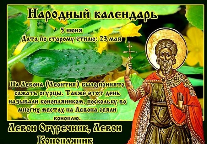 Народный праздник Левон Огуречник (Левон Конопляник) отмечается 5 июня 2023 года (дата по старому стилю – 23 мая). Православная церковь этого числа празднует обретение мощей святителя Леонтия, епископа Ростовского
