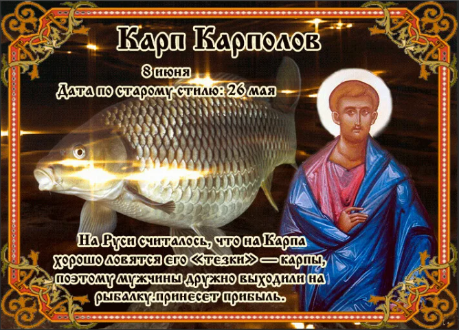 Народный праздник Карп Карполов отмечается 8 июня 2023 года (дата по старому стилю – 26 мая). Православная церковь этого числа чтит память апостола от 70-ти Карпа, епископа.