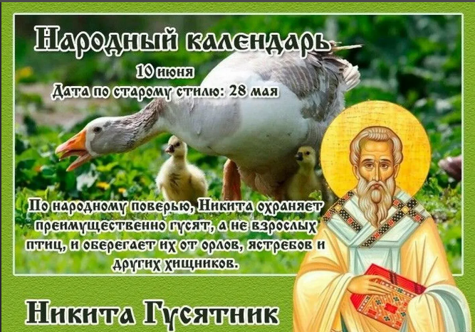 Народный праздник Никита Гусятник отмечается 10 июня 2023 года (дата по старому стилю – 28 мая). Православная церковь в этот день чтит память преподобного Никиты Халкидонского, епископа.
