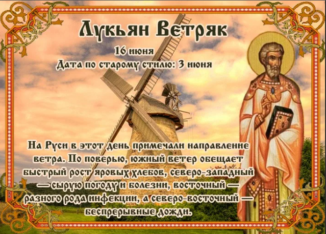 Народный праздник Лукьян Ветряк отмечается 16 июня 2023 года (дата по старому стилю – 3 июня). Этого числа православная церковь вспоминает святого мученика Лукиана Бельгийского.