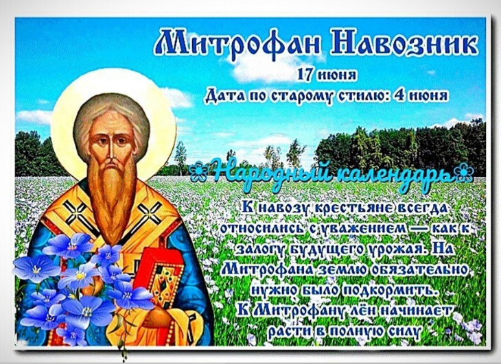 Народный праздник Митрофан Навозник отмечается 17 июня 2023 года (дата по старому стилю – 4 июня). Верующие православной церкви этого числа чтут память святителя Митрофана Константинопольского, патриарха.