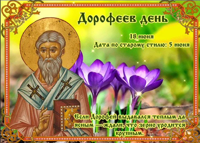 Народный праздник Дорофеев день отмечается 18 июня 2023 года (дата по старому стилю – 5 июня). Православная церковь этого числа чтит память священномученика Дорофея Тирского, епископа.