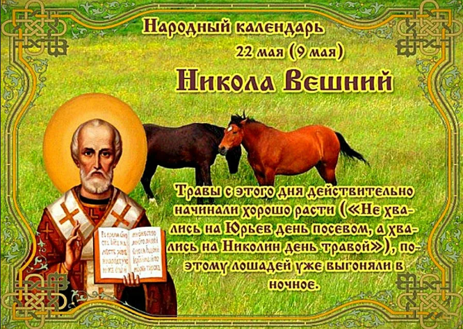 Народный праздник Никола Вешний отмечается 22 мая 2023 года (по старому стилю – 9 мая). По церковному календарю в этот день отмечают перенесение святых останков святителя Николая из Мир Ликийских в Бар.