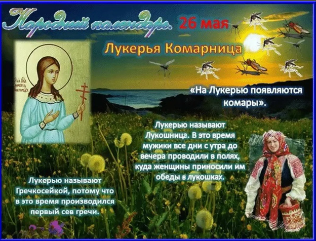 Народный праздник Лукерья Комарница отмечается 26 мая 2023 года (по старому стилю – 13 мая). В православном церковном календаре это дата почтения памяти двух святых по имени Гликерия: мученицы Гликерии девы и праведной Гликерии Новгородской, девы.