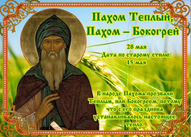 Народный праздник Пахом Теплый отмечается 28 мая 2023 года (дата по старому стилю – 15 мая). Православная церковь в этот день чтит память преподобного Пахомия Великого, Египетского, Фиваидского.