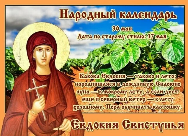 Народный праздник Евдокия Свистунья отмечается 30 мая 2023 года (дата по старому стилю – 17 мая). По церковному календарю в этот день почитается преподобная Евфросиния Московская.