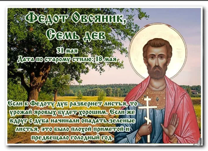 Народный праздник Федот Овсяник отмечается 31 мая 2023 года (дата по старому стилю – 18 мая). В православном календаре этот день посвящается памяти мученика Феодота Анкирского и семи дев-мучениц.