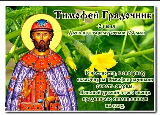 Народный праздник Тимофей Грядочник отмечается 2 июня 2023 года (по старому стилю – 20 мая). В церковном календаре это дата почтения памяти святого Тимофея, князя Псковского, в миру благоверного князя Нальшанского Довмонта (Доманта).