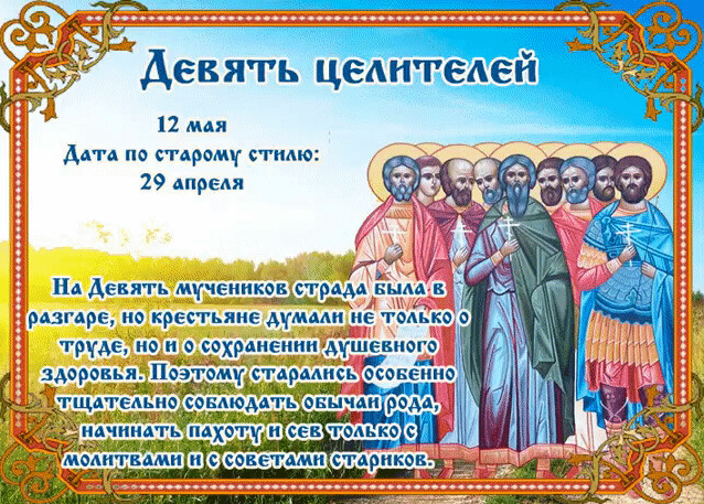 Народный праздник Девять целителей отмечается 12 мая 2023 года (по старому стилю – 29 апреля). В церковном календаре это дата почтения памяти девяти святых мучеников Кизических: Феогнида, Руфа, Антипатра, Феостиха, Артемы, Магна, Феодота, Фавмасия и Филимона.