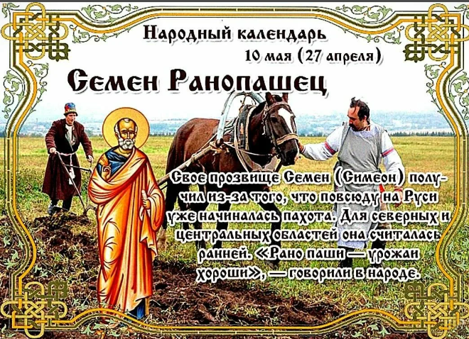 Народный праздник Семен Ранопашец отмечается 10 мая 2023 года (по старому стилю – 27 апреля). В православном церковном календаре эта дата посвящается апостолу от 70-ти Симеону Иерусалимскому, сроднику Господнему по плоти, епископу.