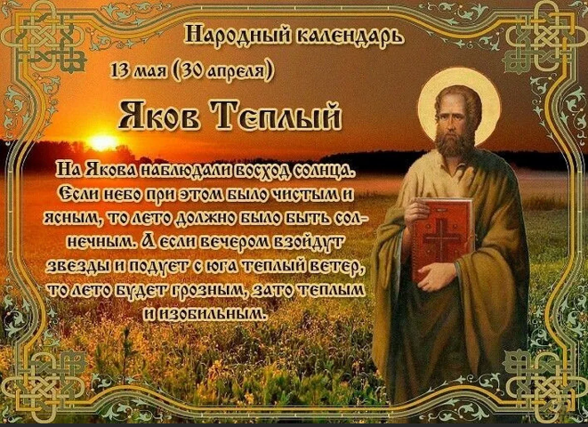 Народный праздник Яков Теплый отмечается 13 мая 2023 года (по старому стилю – 30 апреля). В православном церковном календаре это дата почтения памяти апостола Иакова Зеведеева, брата апостола Иоанна Богослова.