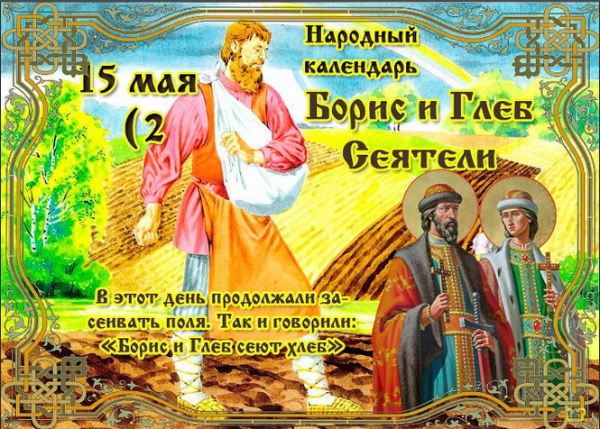 Народный праздник Борис и Глеб Сеятели отмечается 15 мая 2023 года (по старому стилю – 2 мая). В православном церковном календаре эта дата посвящается перенесению святых мощей братьев-великомучеников князей Бориса и Глеба.
