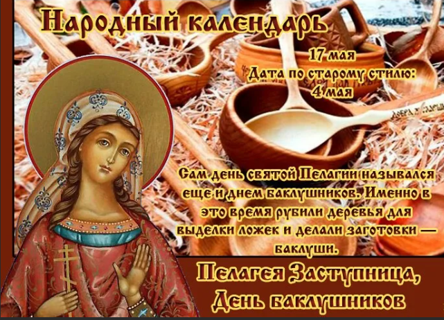 Народный праздник Пелагея Заступница отмечается 17 мая 2023 года (дата по старому стилю – 4 мая). Православная церковь в этот день чтит память страстотерпицы Пелагии Тарсийской, девы.