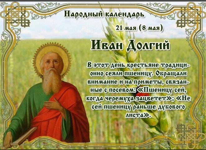 Народный праздник Иван Долгий отмечается 21 мая 2023 года (по старому стилю – 8 мая). По православному календарю это дата почитания памяти апостола Иоанна Богослова.