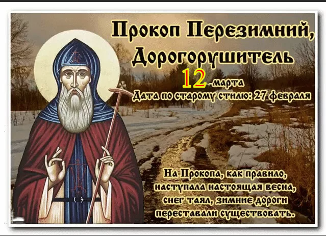 Народный праздник Прокоп Дорогорушитель отмечается 12 марта 2023 года (дата по старому стилю – 27 февраля). В церковном календаре день посвящен памяти святого Прокопия Декаполита.
