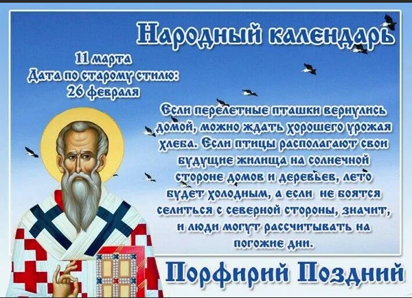 Народный праздник Порфирий Поздний отмечается 11 марта 2023 года (по старому стилю – 26 февраля). В церковном календаре это дата почтения памяти святого Порфирия Газского, архиепископа