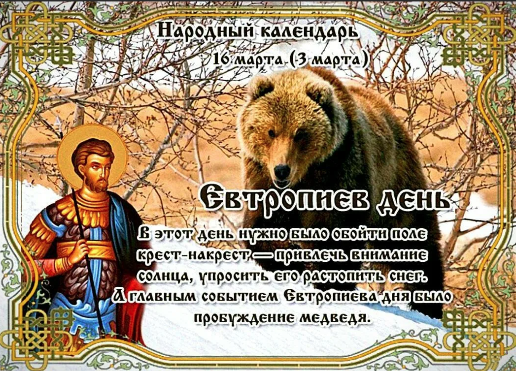 Народный праздник Евтропиев день отмечается 16 марта 2023 года (дата по старому стилю – 3 марта). Верующие православной церкви этого числа чтут память мученика Евтропия Амасийского.