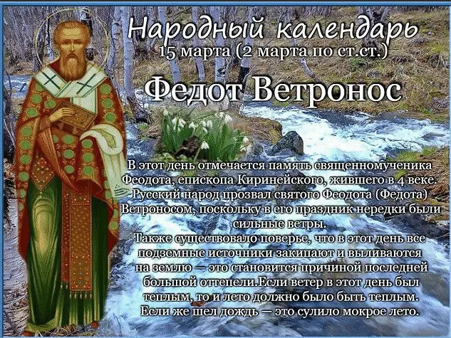 Народный праздник Федот Ветронос отмечается 15 марта 2023 года (по старому стилю – 2 марта). В православном календаре это дата почтения памяти святого мученика Феодота Киринейского, епископа. Название «Ветронос» день получил за сильные ветры.