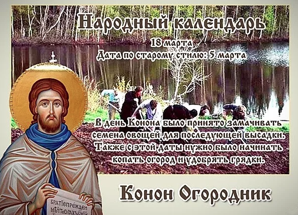 Народный праздник Конон Огородник отмечается 18 марта 2023 года (по старому стилю – 5 марта). В церковном календаре это дата почтения памяти священномученика Конона Мандонского (Памфилийского) – покровителя и защитника огородников, посевов и урожая.