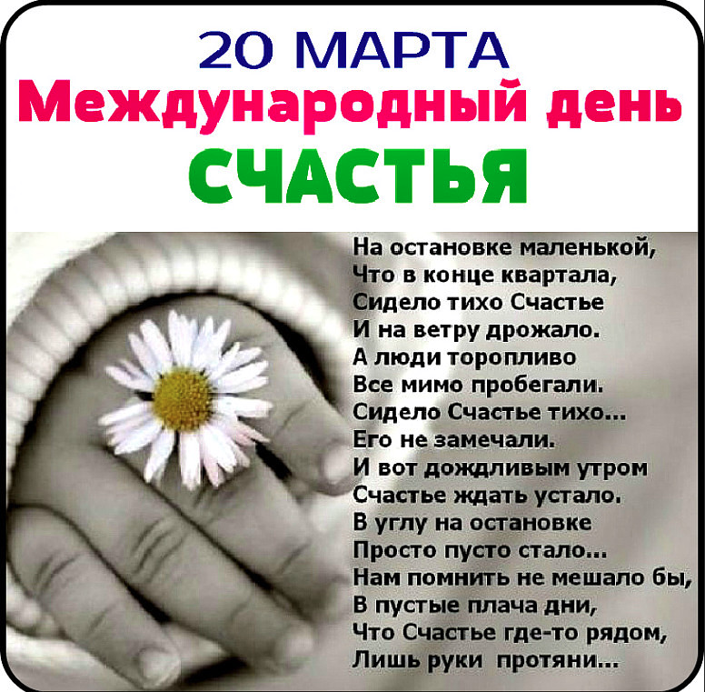 Международный день счастья отмечается 20 марта. В торжествах участвуют деятели общественных движений, благотворительных фондов, психологи, философы. В 2023 году праздник проходит 11-й раз.
