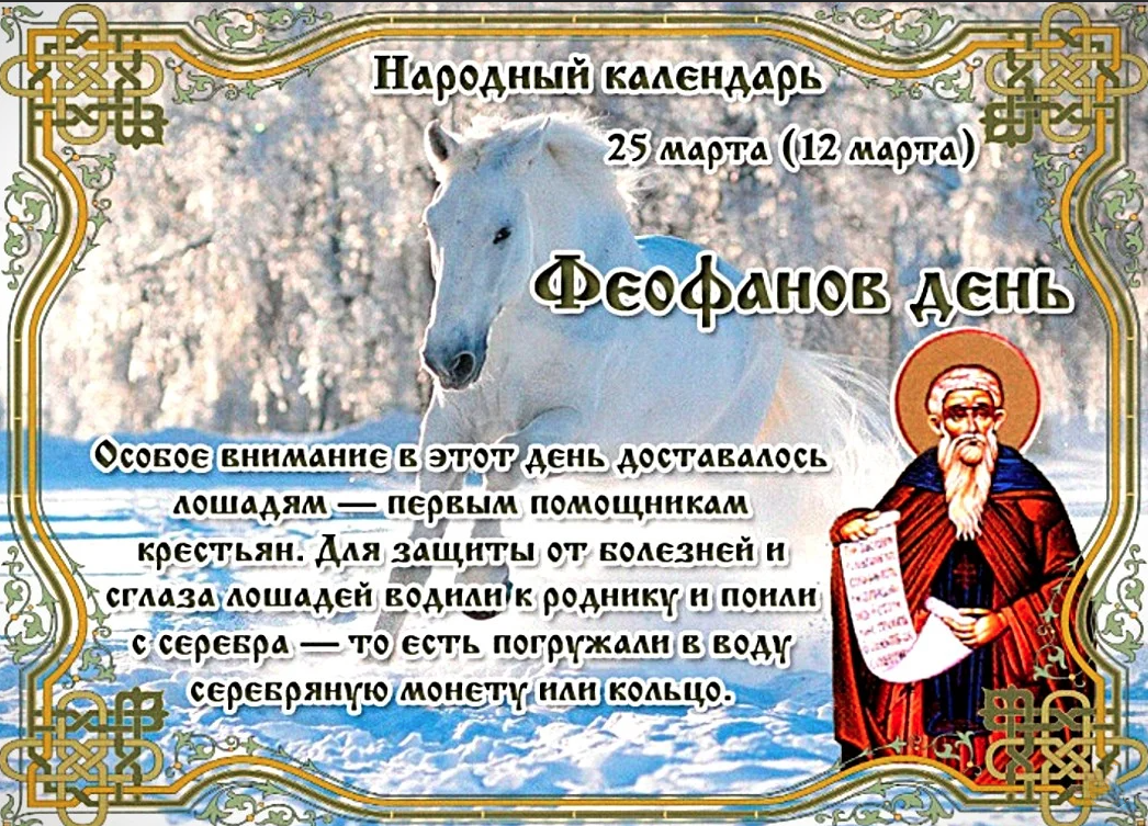 Народный праздник Феофанов день отмечается 25 марта 2023 года (дата по старому стилю – 12 марта). Верующие православной церкви этого числа почитают святого Феофана Сигрианского.