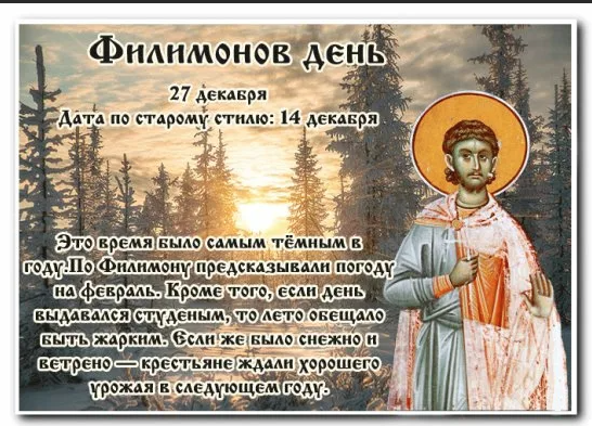 Народный праздник Филимонов день отмечается 27 декабря 2022 года (по старому стилю – 14 декабря). В церковном календаре это дата почтения памяти святых мучеников Аполлония, Филимона, Феотиха и Ариана.