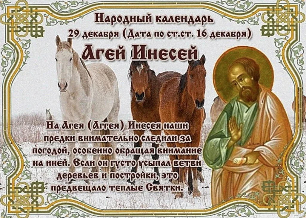 Народный праздник Агеев день отмечается 29 декабря 2022 года (по старому стилю – 16 декабря). В церковном календаре это дата почтения памяти святого ветхозаветного пророка Аггея.