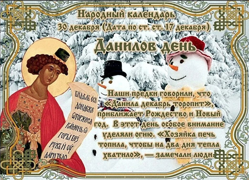 Народный праздник Данилов день отмечается 30 декабря 2022 года (по старому стилю – 17 декабря). В церковном календаре это дата почтения памяти пророка Даниила и трех святых отроков – Анания, Азария и Мисаила.