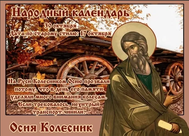 Народный праздник Осия Колесник отмечается 30 октября 2022 года (дата по старому стилю – 17 октября). В этот день верующие православной церкви чтут память ветхозаветного святого пророка Осии, входящего в число 12-ти малых пророков.