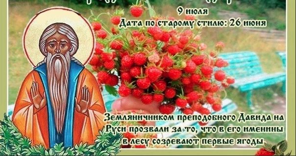 Народный праздник Давид Земляничник отмечается 9 июля 2022 года (дата по старому стилю – 26 июня). Верующие православной церкви этого числа вспоминают святого Давида Солунского (Фессалоникийского), отшельника.