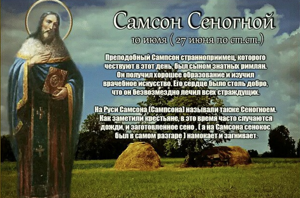 Народный праздник Самсон Сеногной отмечается 10 июля 2022 года (по старому стилю – 27 июня). В православном церковном календаре дата посвящается святому Сампсону Странноприимцу.