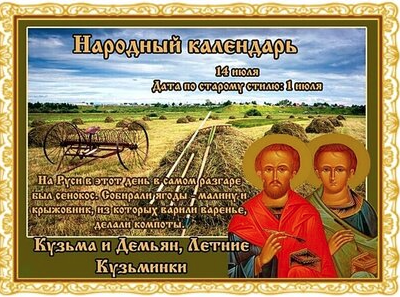 Народный праздник Кузьминки летние отмечается 14 июля 2022 года (по старому стилю – 1 июля). В церковном календаре дата посвящается мученикам-бессребреникам Косме и Дамиану Римским.