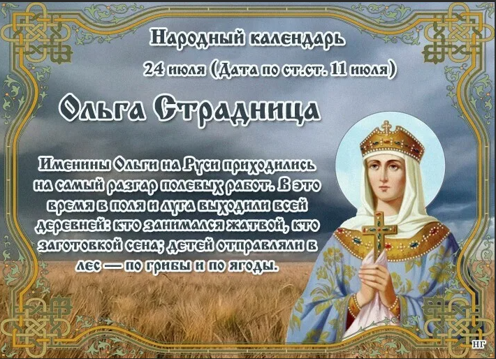 Народный праздник Ольга Страдница отмечается 24 июля 2022 года (дата по старому стилю – 11 июля). В церковном календаре день посвящен равноапостольной княгине Ольге (в крещении Елене).