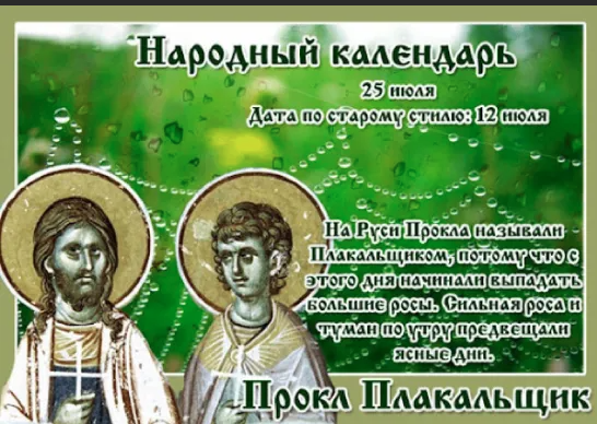 Народный праздник Прокл Плакальщик отмечается 25 июля 2022 года (по старому стилю – 12 июля). В православном церковном календаре это дата почтения памяти мученика Прокла.