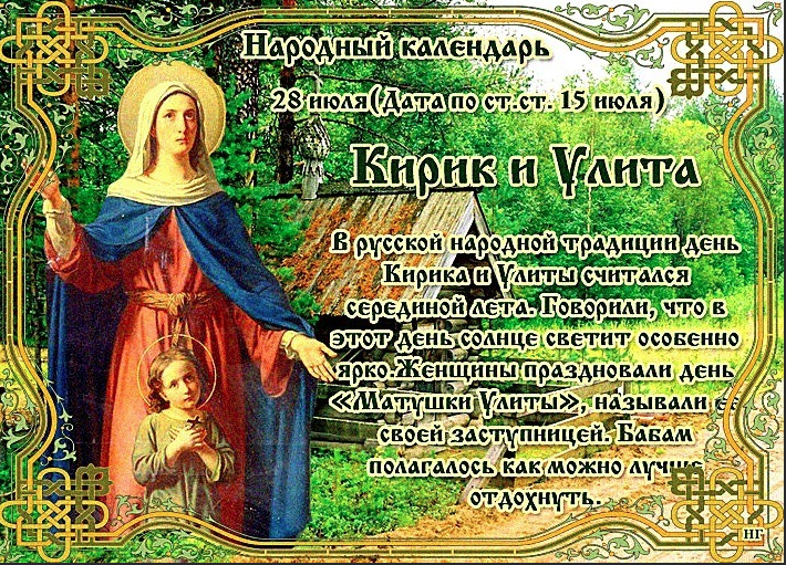 Народный праздник Кирик и Улита отмечается 28 июля 2022 года (по старому стилю – 15 июля). В православном церковном календаре это дата почтения памяти мучеников Кирика и Иулитты.