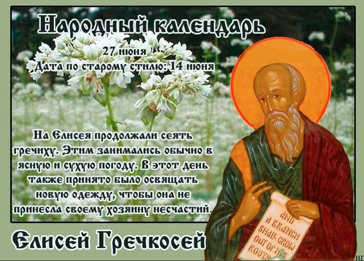 Народный праздник Елисей Гречкосей отмечается 27 июня 2022 года (по старому стилю – 14 июня). В православном календаре это дата почтения памяти пророка Елисея.