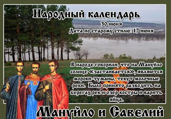 Народный праздник Мануйло и Савелий отмечается 30 июня 2022 года (дата по старому стилю – 17 июня). В этот день православная церковь почитает память трех братьев-мучеников: Мануила, Савела и Исмаила.