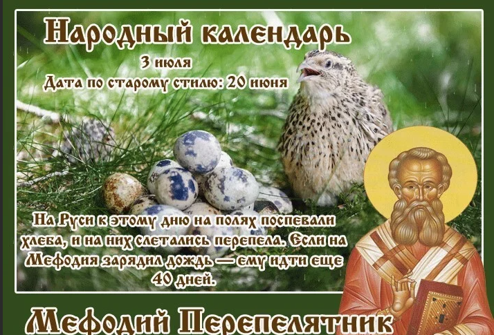 Народный праздник Мефодий Перепелятник отмечается 3 июля 2022 года (по старому стилю – 20 июня). По церковному календарю это дата почтения памяти святого мученика Мефодия Патарского, Олимпийского, епископа.