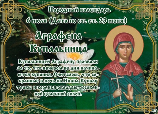 Народный праздник Аграфена Купальница отмечается 6 июля 2022 года (по старому стилю – 23 июня). В православном календаре это дата почтения памяти мученицы Агриппины Римляныни.