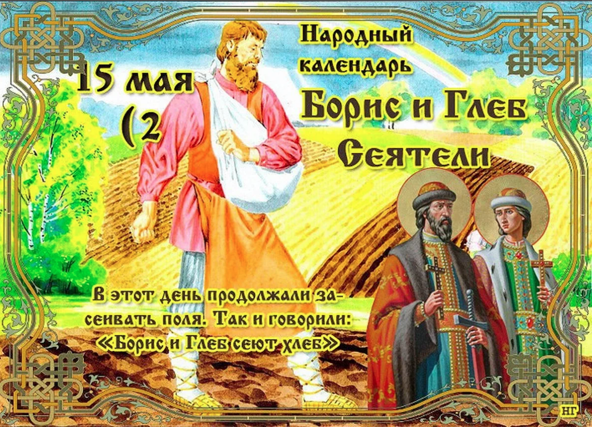 Народный праздник Борис и Глеб Сеятели отмечается 15 мая 2022 года (по старому стилю – 2 мая). В православном церковном календаре эта дата посвящается перенесению святых мощей братьев-великомучеников князей Бориса и Глеба
