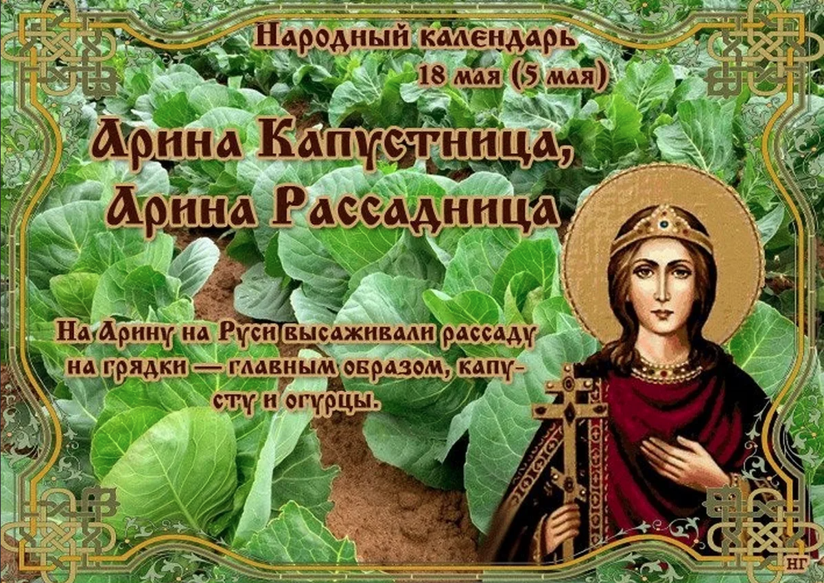 Народный праздник Арина Капустница (Рассадница) отмечается 18 мая 2022 года (дата по старому стилю – 5 мая). По православному церковному календарю в этот день чтится память великой мученицы Ирины Македонской.